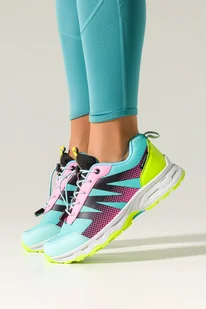 Turkusowe buty sportowe trekkingowe damskie wodoodporne na żłobionej podeszwie z regulowaną elastyczną sznurówką różowe wstawki Casu 7590-1D