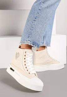 Beżowe Futerkowe Trampki na Platformie z Ozdobną Naszywką w Kształcie Serca Aelinna