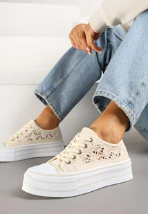 Beżowe Trampki na Grubej Podeszwie z Ażurową Cholewką Felariona