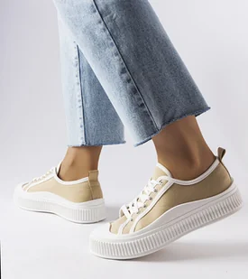 Beżowe trampki na platformie Alfianello są idealne na letnie, gorące dni. Wykonane z innowacyjnej gumy, zapewniają wygodę i komfort noszenia. Mają niski, szn...
