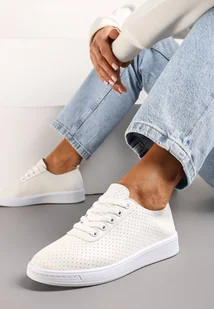 Beżowo-Białe Sznurowane Tenisówki z Ozdobną Taśmą na Tyle i Perforacją Kavinna - Renee