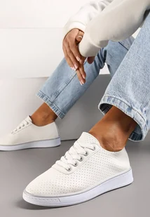 Beżowo-Szare Sznurowane Tenisówki z Ozdobną Taśmą na Tyle i Perforacją Kavinna - Renee