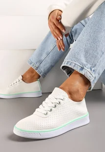 Beżowo-Zielone Sznurowane Tenisówki z Ozdobną Taśmą na Tyle i Perforacją Kavinna - Renee