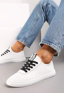 Biało-Czarne Tenisówki ze Skóry Naturalnej z Perforacją i Tasiemką z Napisem Toccatia - Renee