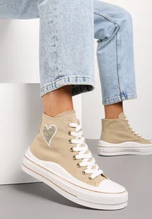 Ciemnobeżowe Trampki za Kostkę na Niskiej Platformie z Brokatową Ozdobą w Kształcie Serca Annexla
