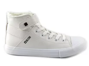Trampki renomowanej marki Big Star zostały wykonane z zewnątrz z wysokogatunkowej skóry ekologicznej białej. Wyściółka ocieplona jest miękkim polarem, dzięki czemu model nada się także na chłodniejsze dni. Cholewkę zdobi logo marki w kontrastowym kolorze. Oprócz regulacji sznurowadeł, obuwie można dopasować paskiem na wysokości kostki. Całość została osadzona na grubej podeszwie, która zapewnia dobrą izolację od podłoża.