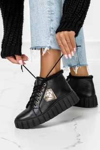Czarne trampki skórzane z futerkiem na platformie sznurowane PRODUKT POLSKI Casu 3252-N