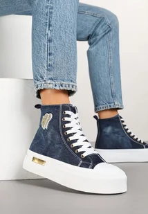 Granatowe Trampki na Platformie z Wysoką Cholewką z Haftem z Brokatem Elanitha