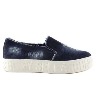 Niesamowite jeansowe trampki slip-on, stylowo przecierane. Mają grubą białą podeszwę z tłoczonymi napisami. Buty są bardzo miękkie i rewelacyjnie wyglądają na nodze. Jeansowe slip-on podeszwa z napisami Z-4 Navy granatowe. Sprawdź na butymodne.