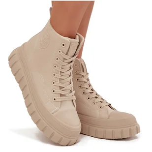 Ocieplane Trampki Damskie Na Platformie Z Eko Skóry Big Star SS274535 Beżowe Trampki damskie od marki Big Star łączą modny, miejski styl z wygodą noszenia na co dzień. Wykonane z eko skóry, osadzone na stabilnej platformie z gumowego tworzywa, zapewniają komfort i pewny krok na każdej nawierzchni. Model posiada sznurowanie i zamek, co umożliwia łatwe zakładanie oraz idealne dopasowanie do stopy, a delikatne ocieplenie wewnątrz butów gwarantuje ciepło w chłodniejsze dni. Trampki świetnie sprawdzą się w casualowych stylizacjach, dodając im nowoczesnego charakteru. Przy wyborze rozmiaru prosimy sugerować się tabelą rozmiarów.
