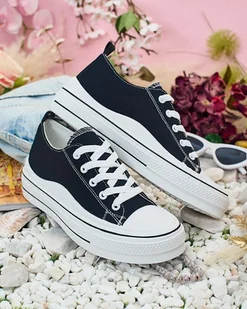 Stylowe sportowe trampki damskie wykonane z materiału tkaninowego. Model na wygodnej platformie. Cholewka jest sznurowana. Świetne do tworzenia casualowych o...