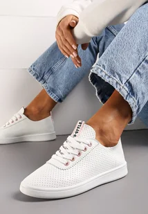 Biało-Różowe Tenisówki Ozdobione Taśmą z Napisem na Języku i Pięcie Cholewka z Perforacją Aelita