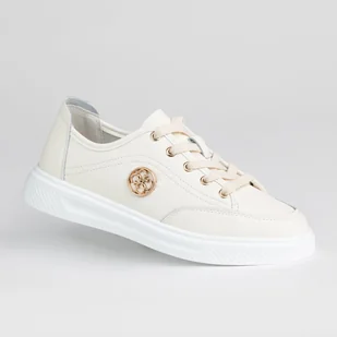 Sportowe damskie trampki skóra naturalna GOODIN GD-XF-183 beżowe lekkie 38 KLASYCZNA PROPOZYCJA DAMSKICH SKÓRZANYCH TRAMPEK OD MARKI GOODIN Cholewka wykonana z naturalnej skóry licowej. Z boku na cholewce znajduje się logo marki w kolorze złota. Obuwie wiązane jest w tradycyjny sposób na sznurówki w kolorze cholewki. Wkładka w prezentowanym obuwiu wykonana jest z naturalnej skóry licowej co zwiększa komfort użytkowania. Podeszwa w kolorze białym wykonana z tworzywa sztucznego zapewniającego amortyzację podczas wiosennych spacerów.