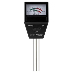 Tester podłoża 2 w 1 Jest to urządzenie z funkcją pomiaru pH, urodzajności gleby. Czujki znajdują się na końcu szpikulców. Odczytu dokonuje się na skali znajdującej się w plastikowej obudowie. Zakres pomiarowy pH od 1 do 9. Długość sondy: