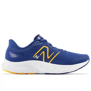 Buty męskie New Balance Fresh Foam Evoz ST MEVOVLB – niebieskie Męskie buty do biegania z dużą amortyzacją z serii Evoz ST, dedykowane dla osób ze stopą neutralną lub supinującą, do biegania po twardych nawierzchniach gruntowych i asfalcie. Cholewkę wykonano z siateczkowego materiału, który zapewnia odpowiednie odprowadzanie wilgoci i przepływ powietrza, wspomagając dodatkowo utrzymanie suchości podczas intensywnych treningów. Wytrzymały zapiętek z mocnej pianki TPU gwarantuje doskonałe wsparcie dla biegacza podczas biegu. Zastosowana w podeszwie środkowej innowacyjna, ekka pianka Fresh Foam odpowiada za amortyzację, absorpcję wstrząsów, prawidłowe przetoczenie stopy oraz maksymalny zwrot energii. Bieżnik podeszwy zewnętrznej wykonano z miękkiej pianki EVA oraz twardej gumy.