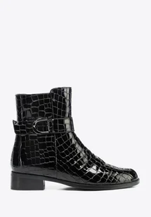 Noś je do dopasowanych spodni, eleganckiej spódnicy lub sukienki midi. Dodaj płaszcz w klasycznym kroju albo skórzaną ramoneskę, a całość uzupełnij elegancką torebką na ramię lub szykowną kopertówką. Botki staną się mocnym akcentem Twojego looku. Kluczowe cechy: Materiał: Lakierowana skóra naturalna o tłoczeniu croco – przyciąga wzrok eleganckim połyskiem, wyróżnia się trwałością i zachwyca luksusowym wykończeniem, a przy tym pozostaje praktyczna i łatwa w pielęgnacji.