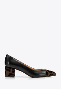 Materiał: Harmonijne połączenie gładkiej skóry licowej oraz miękkiego zamszu, które tworzy eleganckie, trwałe i wyjątkowo przyjemne w dotyku wykończenie pełne charakteru. Design: Noski i obcas w panterkę ze skóry zamszowej dodają modowego wyrazu i przyciągają spojrzenia. Noski w szpic: Wysmuklają stopy i nadają całości lekkości. Obcas typu klocek:
