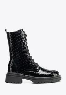 Damskie glany o fakturze croco – odważny styl i niezawodny komfort Postaw na charakter i wyrazisty look dzięki damskim glanom wykonanym ze skóry naturalnej lakierowanej z fakturą croco. Ich designerskie wykończenie przyciąga wzrok, a klasyczny, mocny fason glanów dodaje każdej stylizacji nowoczesnego i nieco buntowniczego charakteru. Czarne sznurówki w połączeniu z grafitowymi elementami metalowymi podkreślają wyjątkowy design, a podeszwa typu track gwarantuje przyczepność i stabilność nawet w trudniejszych warunkach. Dla kogo? Jeśli szukasz butów, które wyróżnią Cię z tłumu, połączą modny charakter z funkcjonalnością i zapewnią komfort przez cały dzień – te glany będą strzałem w dziesiątkę. Nasza rada: