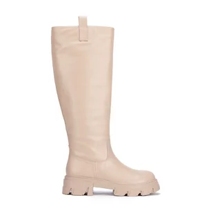 Wysoka cholewka ma suwak od wewnętrznej strony, dzięki czemu łatwo będzie je zakładać. Gładki fason bez zdobień dopasujesz i do długiego płaszcza, i do ramoneski lub pikowanej kurtki. Damskie kozaki ze skóry na grubej podeszwie to świetny wybór dla każdej nowoczesnej kobiety. Nasza rada: to świetne buty do wzorzystych stylizacji.