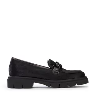 Damskie mokasyny z łańcuchem. W tych wyjątkowych butach nie przejdziesz niezauważona. Zostały wykonane we Włoszech ze skóry z włosiem, która nadaje całości wyjątkowego charakteru. Klasyczny fason mokasynów dopełnia lekko połyskujący łańcuch w kolorze czarnym. Dzięki grubej platformie komfortowo przechodzisz w nich przez wiele godzin.