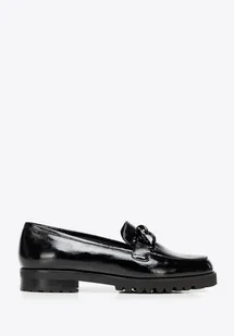 Damskie mokasyny ze skóry lakierowanej z ozdobnym łańcuchem czarne