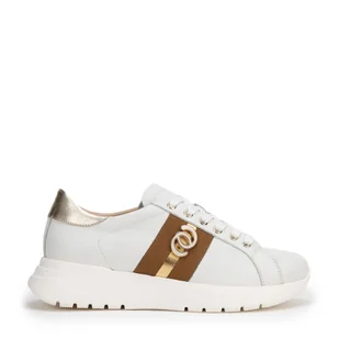 Sneakersy skórzane na platformie ze złotymi detalami Zanurz się w luksusie i wygodzie z tymi wyjątkowymi sneakersami! Wykonane ze skóry naturalnej, zachwycają błyszczącymi złotymi akcentami. Metalowe detale nadają im charakteru, a gumowa podeszwa na platformie nie tylko podkreśla nowoczesny design, ale także zapewnia komfort na każdym kroku. Skórzana wyściółka i wkładka otulają stopę miękkością, gwarantując wygodę przez cały dzień. Stylowe i praktyczne – to buty, które podniosą każdą stylizację na wyższy poziom. Dla kogo? Jeśli szukasz butów, które łączą elegancję i codzienny komfort, to ten model jest dla Ciebie.