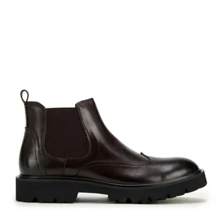 Męskie buty skórzane. W tych męskich sztybletach komfortowo przechodzisz chłodniejsze miesiące. Wykonane zostały z wysokiej jakości skóry naturalnej o lekkim połysku. Nosek oraz tył buta wykończony jest obszyciem o ząbkowanych krawędziach. Mają lekką podeszwę na grubej platformie, a dzięki żłobieniu zapewnią dobrą przyczepność do podłoża.