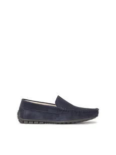 Granatowe mokasyny męskie wykonane z wysokiej jakości zamszu to klasyczny fason typu driving mocs posiadający specjalną nakładkę zachodzącą na piętę, która znakomicie sprawdza się podczas prowadzenia samochodu. Ciekawy akcent tego modelu stanowi tłoczone logo KAZAR na boku oraz trójkolorowa taśma wewnątrz cholewki zabezpieczająca ją przed naciągnięciem. Minimalistyczne mokasyny sprawdzą się nie tylko w casualowych stylizacjach, ale i tych nieco bardziej formalnych.