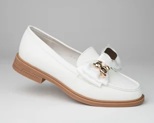 Mokasyny JN-670 z kokardą slip on białe Fenomenalna propozycja Mokasyn w kolorze białym . Produkt wykonany z wysokogatunkowej skóry ekologicznej. Buciki ozdobione stylową kokardą na której znajduje się złoty przesłodki miś. Podeszwa wykonana z tworzywa sztucznego w kolorze brązowym. Buty przepięknie prezentują się na stopie i będą idealnie pasować do każdej letniej stylizacji.