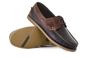 Męskie mokasyny typu boat shoes wykonane z naturalnej skóry. Model w granatowym kolorze z brązowymi akcentami, inspirowany klasycznym fasonem żeglarskim. Wsu...