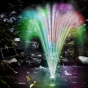 Pompa Solarna LED - z baterią i panelem słonecznym. Fontanna solarna z kolektorami słonecznymi o wysokiej wydajności jest całkowicie niezależna od zasilania sieciowego, dzięki wydajnej baterii pracuje nawet przy złej pogodzie lub w ciemności. Cechy i Zalety Zintegrowany czujnik automatycznie włącza wiązkę podświetlenia LED o zmierzchu, zapewniając imponujący efekt świetlny. Fontanna może zostać podświetlona na biało lub w kolorze. Fontanna może być sterowana bezpośrednio z panelu sterowania lub za pośrednictwem pilota z tarasu lub z balkonu.