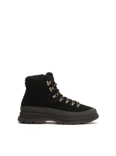 Sznurowane trzewiki wykonane z czarnego zamszu łączą elegancję z nowoczesnym designem. Metalowe uchwyty na sznurówki w kolorze starego złota dodają im wyjątkowego charakteru i subtelnego, vintage'owego uroku. Podeszwa, ozdobiona finezyjnymi żłobieniami, prezentuje się niezwykle atrakcyjnie. Prezentowane trzewiki doskonale sprawdzą się w casualowych stylizacjach, zapewniając komfort noszenia i modny wygląd.
