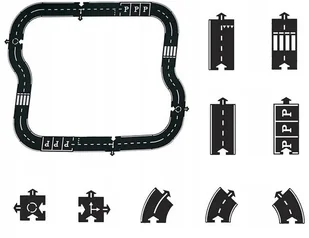 - 24 elementy w zestawie (zakręty, proste drogi, skrzyżowania, ronda, przejścia, miejsca parkingowe)