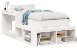 Stelaż z listew zapewniający optymalne podparcie materaca i wentylację. Przestronna przestrzeń pod łóżkiem idealna na pojemniki, kosze lub dodatkowe szuflady. Wielofunkcyjna szafka nocna z biurkiem – wszystko pod ręką bez zbędnego bałaganu. Design oszczędzający miejsce, idealny nawet do mniejszych sypialni. Naturalne piękno i trwałość: