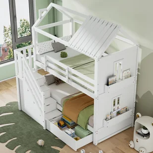 Dużo miejsca do przechowywania: Szuflady pod łóżkiem i schodkami oferują dużo miejsca do przechowywania, ułatwiając rodzicom i dzieciom uporządkowanie swoich rzeczy i przyczyniając się do bardziej zorganizowanej i funkcjonalnej sypialni.