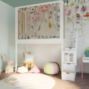 Łóżko antresola Lamelio – łóżko domek z lamelami i schodami ze schowkami