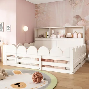 Otwarta półka z trzema przegrodami umieszczona z boku łóżka zapewnia praktyczne miejsce do przechowywania zabawek i codziennych przedmiotów dziecka. Może również służyć do eksponowania albumów ze zdjęciami lub prac plastycznych.