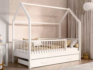 Białe łóżko domek D9S w rozmiarze 80x160 z szufladą, stelażem i barierką zabezpieczającą – bezpieczna przestrzeń snu, zabawy i dziecięcych marzeń Stwórz wyjątkową, przytulną przestrzeń do snu i zabawy dla swojego dziecka z łóżeczkiem D9S w kształcie domku. Wykonane z wysokiej jakości litej sosny, w kolorze białym, łączy w sobie estetykę, funkcjonalność i bezpieczeństwo. Łóżko dziecięce Domek D9S Komfort i bezpieczeństwo - Model D9S zapewnia maksymalny komfort snu oraz bezpieczeństwo użytkowania. Barierki zabezpieczające wykonane z okrągłych, gładko szlifowanych listewek nie tylko wyglądają subtelnie i elegancko, ale też skutecznie chronią dziecko przed wypadnięciem. Wszystkie elementy łóżeczka są dokładnie zaokrąglone, by zminimalizować ryzyko urazów i zadrapań – to rozwiązanie bezpieczne nawet dla najbardziej aktywnych maluchów.