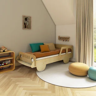 Łóżko samochód dla chłopca i dziewczynki – spełnienie dziecięcych marzeń! Stylowe łóżko dziecięce w kształcie auta typu Jeep to doskonały wybór do każdego pokoju dziecięcego. Dostępne w rozmiarach 70x140 cm, 80x160 cm i 80x180 cm, pasuje zarówno dla młodszych, jak i starszych dzieci. Wykonane z naturalnej sklejki sosnowej, posiada certyfikat FSC, co oznacza, że drewno pochodzi z odpowiedzialnych źródeł. Konstrukcja łóżka jest stabilna i wytrzymała – maksymalne obciążenie to aż 120 kg, dzięki czemu dziecko może swobodnie bawić się, odpoczywać i przytulać z rodzicami. W zestawie znajduje się stelaż z tego samego materiału (sklejka sosnowa).