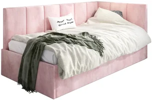 Łóżko młodzieżowe AURA 120x200 różowe z tapicerowanym panelem L i pojemnikiem na pościel MKPOL