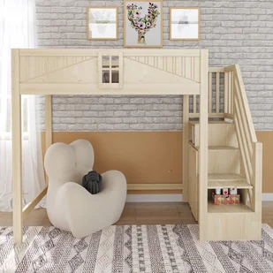 To łóżko piętrowe może służyć jako miejsce do spania i oferuje dużą przestrzeń do przechowywania pod spodem, umożliwiając aranżację jako biurko, strefę relaksu lub miejsce pracy.
