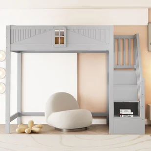 To łóżko piętrowe może służyć jako miejsce do spania i oferuje dużą przestrzeń do przechowywania pod spodem, umożliwiając aranżację jako biurko, strefę relaksu lub miejsce pracy.