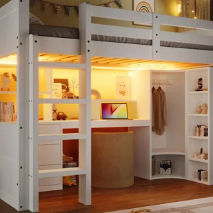 Górne łóżko wyposażone jest w solidne barierki ochronne na całym obwodzie, aby zapobiec upadkom i zapewnić bezpieczeństwo dziecka podczas snu. Odpowiednie dla dzieci powyżej szóstego roku życia.