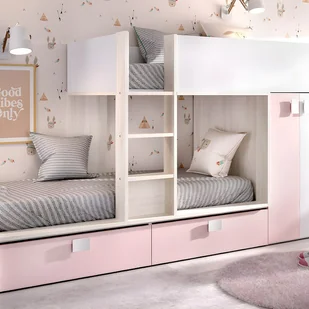 Wygospodaruj więcej miejsca w dziecięcym pokoju dzięki łóżku piętrowemu JUANITO. Wbudowana szafa oraz 2 duże szuflady pomieszczą wszystkie niezbędne rzeczy.