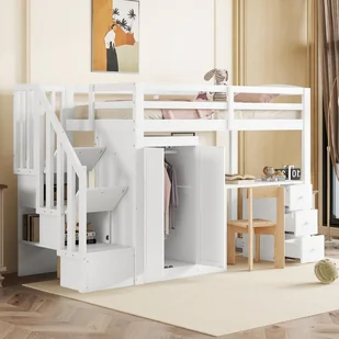 Bardzo duża przestrzeń do przechowywania: To łóżko piętrowe składa się z kilku części: łóżka, biurka, szafy, trzech szuflad, otwartej szafki, a nawet schodów do przechowywania! Dołączone schody również zapewniają przestrzeń do przechowywania.