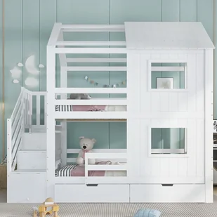 Delikatne okna i dach nadają łóżku urokliwy charakter, przekształcając pokój dziecięcy w ciepłą i przyjazną przestrzeń.
