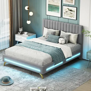 Łóżko tapicerowane Flieks 140x200cm z LED, łóżko młodzieżowe podwójne ze stelażem listwowym, łóżko dziecięce klasyczne z zagłówkiem, aksamit, szary