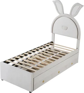 To tapicerowane łóżko dziecięce w kształcie króliczka z paskami świetlnymi LED, wysuwanym łóżkiem i trzema szufladami jest urocze i praktyczne. Może być również używane jako rozkładana sofa. Cechy produktu: 🌱 Uszy króliczkau wezgłowia łóżka: łóżko dziecięce w kształcie króliczka jest wyposażone w zmieniające kolor paski świetlne LED.