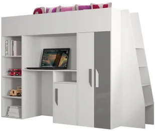 Funkcjonalne łóżko piętrowe ze zintegrowanym biurkiem to przemyślane rozwiązanie do pokoju dziecięcego. Komfort i dobry wygląd w jednym. Mebel wyposażony jest również w szafę i regał, tworząc w pełni wyposażony pokój dziecięcy w jednym meblu.