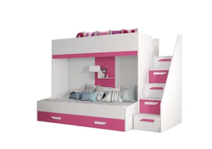- całość wykonana z wysokiej jakości płyty meblowej laminowanej o grubości 16 mm- Krawędzie starannie wykończone okleiną PCV o grubości 0,5 mm- Elementy łączone są ze sobą za pomocą złączy mimośrodowych- Bez materaca- Uchwyty wykonane z lakierowanej płyty MDF- Szuflady ukryte w schodach na aluminiowych prowadnicach- Możliwość wyboru strony schodów (prawa/lewa) łóżka podczas montażu Kolor: